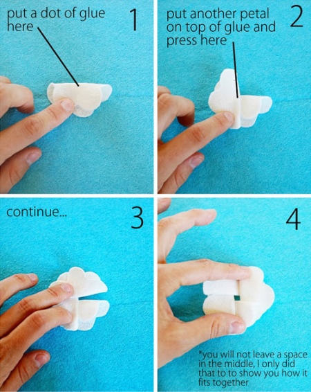 Vous pouvez décorer le pansement avec des perles, des strass ou une fleur décorative. Pour sa fabrication, vous aurez besoin d'un tissu dense mais doux - par exemple, le foamiran. Découpez quatre cercles identiques du tissu sélectionné. Pliez le premier en deux, mettez une petite quantité de colle au centre du pli et placez un second cercle dessus, également plié - de cette façon, connectez tous les cercles en exerçant une légère pression sur la pièce centrale. Fleur prête! Il peut être cousu ou collé sur le produit.