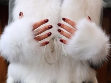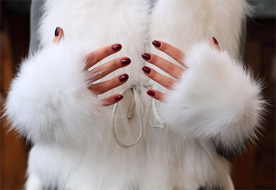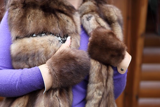 I guanti di pelliccia in combinazione con un gilet di pelliccia simile costituiscono un'immagine armoniosa per un inverno nevoso.