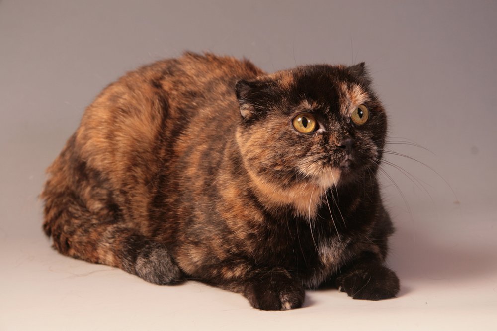 Il y a aussi des chats écossais couleur tortuequi combine les couleurs noir, rouge, crème, bleu et chocolat. Toutes les nuances énumérées sont mélangées uniformément dans tout le corps de l'animal. Le sous-poil de ces animaux est gris et le nez est bicolore.