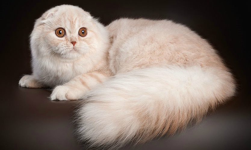 La queue a une longueur moyenne, elle est flexible et rétrécie jusqu'au bout. Le chat aux cheveux longs Scottish Fold a un beau pelage, il est doux, léger, soyeux et a une structure uniforme.Sur le dos, le visage et les pattes, le pelage est plus court que sur les autres parties du corps.