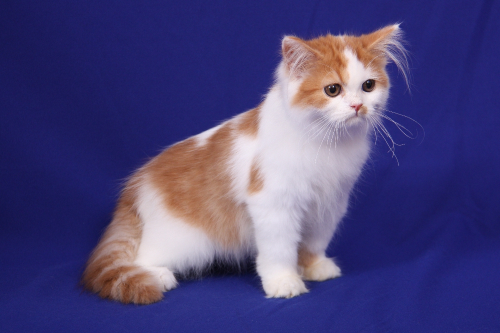- Arlequin. Un cinquième seulement du corps d'un animal est peint en blanc. De grandes taches d'une nuance différente peuvent être présentes sur le manteau de fourrure et se situent le plus souvent sur la tête, le dos et la croupe. La queue est généralement peinte d'une seule couleur. Si la couleur du chat est le blanc prédominant, ses yeux sont généralement bleus.