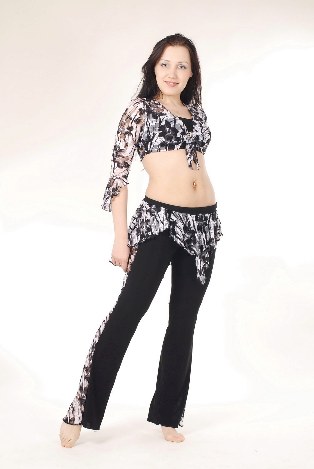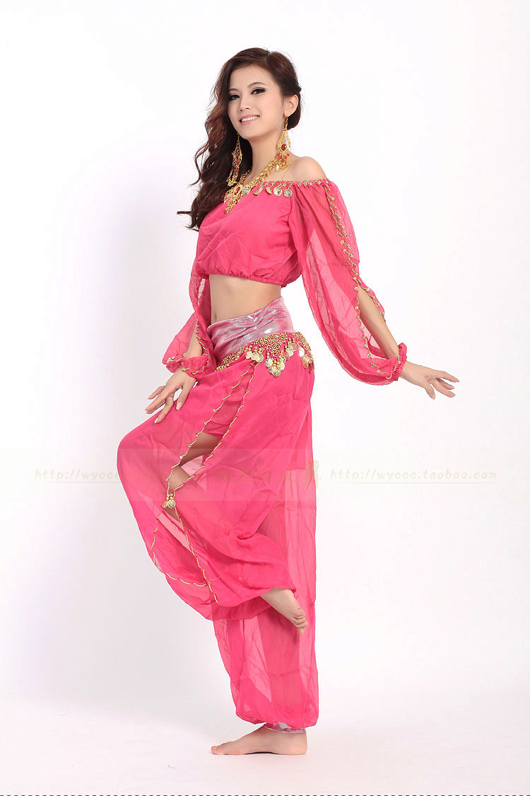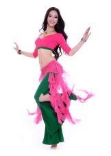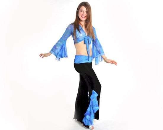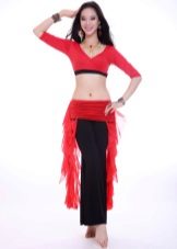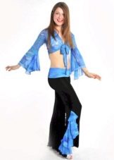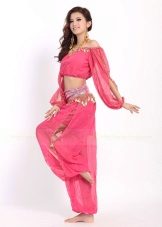 En bas du costume, vous pouvez choisir le pantalonqui soulignent la rondeur des hanches. Les pantalons classiques pour la danse orientale sont larges, ont une coupe sur les hanches, se battent à la cheville.