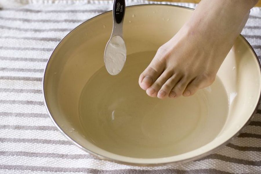 L'eau pour cette procédure de traitement doit être assez chaude, mais ne brûle pas. La température optimale est d'environ 45 degrés. Il est nécessaire d’ajouter du soda, du sel de mer et de l’huile à l’eau chauffée, puis de bien mélanger le tout. Après cela, le pied doit être placé dans le bain, affecté par le champignon, et conservé jusqu'à ce que l'eau refroidisse.