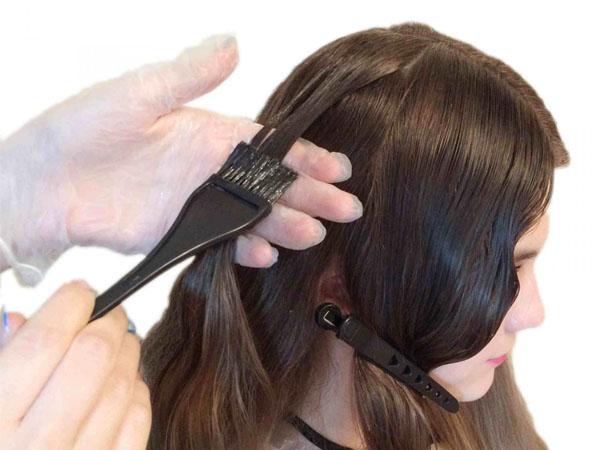 - le maître répartit la masse colorante des racines aux pointes des cheveux avec une brosse spéciale;