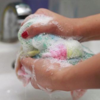 - Ensuite, l'article est lavé de la manière la plus commode en ajoutant une grande quantité de savon ou de détergent à lessive.