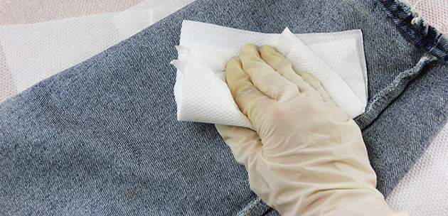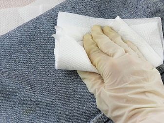 N'oubliez pas de prétraiter la surface du pantalon avec une solution d'ammoniaque et de placer le coton imbibé de solution pendant 10-15 minutes.