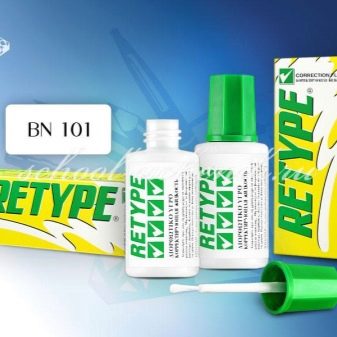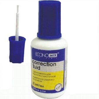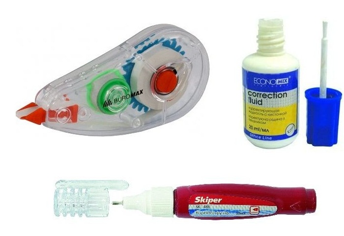 En plus, il y a du "mastic" liquide et sec. Les premiers sont des liquides correcteurs dans une bouteille en plastique avec une brosse pratique, ainsi que des crayons / stylos remplis de liquide correcteur. Par coups secs, des rouleaux, à l’intérieur desquels est placé un ruban fortement tordu avec une composition sèche bien appliquée.