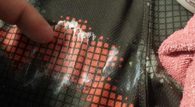 Rappelez-vous que les éclaboussures du trait ne sont complètement effacées que lorsqu’il ya trempage préalable. N'essayez pas de frotter le "mastic" - il absorbe uniquement plus profondément dans les fibres.