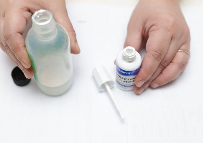 Pour se débarrasser des taches blanches, il faut commencer par étudier la composition du correcteur, qui est généralement écrite sur la bouteille. Déterminer que c'est complètement impossible, parce que le plus souvent c'est le secret de l'entreprise. Certains composés chimiques sont présents dans toutes les compositions correctives, quel que soit leur fabricant. Ceux-ci comprennent le carbonate de calcium et le dioxyde de titane, ainsi que de l'essence hautement raffinée. Cependant, le critère principal est la base et sa composition est toujours indiquée sur l'étiquette.