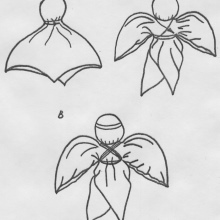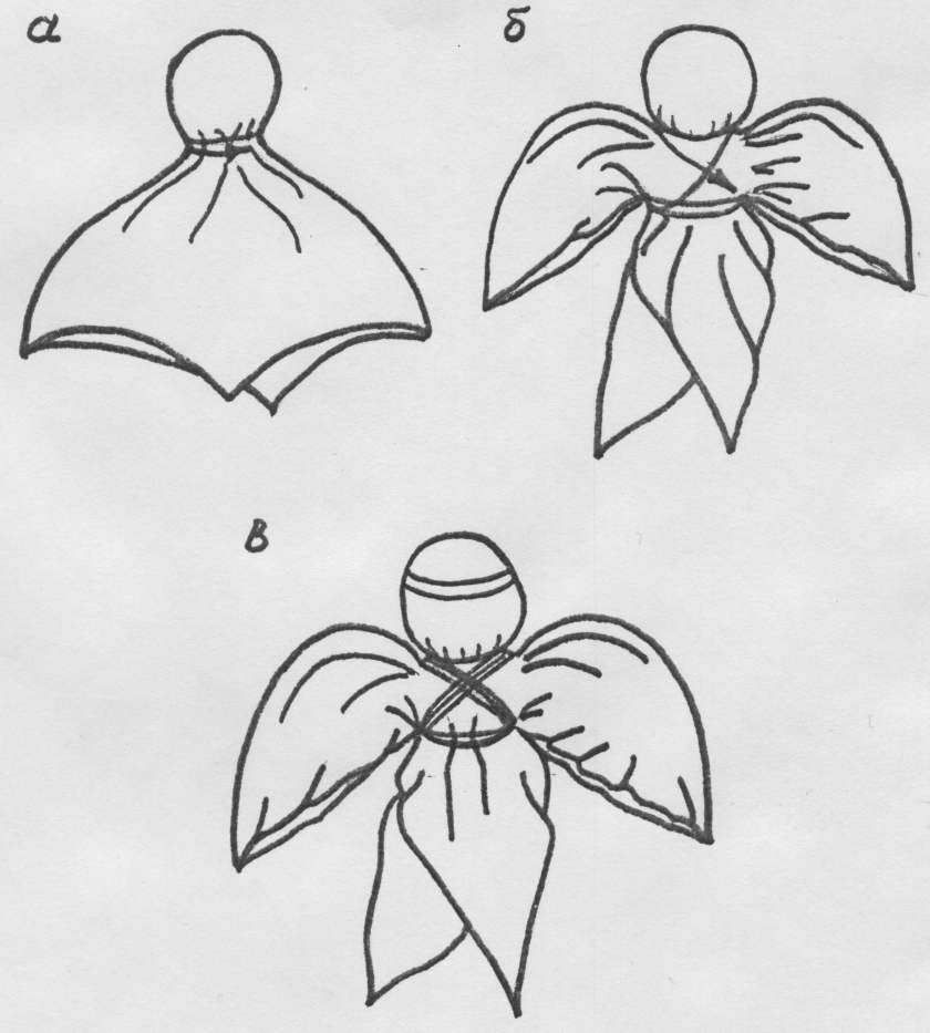 Pour les travaux manuels, vous aurez besoin d'un petit lambeau de tissu blanc ou argenté, d'un rembourrage tel qu'un agent de protection d'hiver, d'un caoutchouc mousse ou de hollowfiber, et d'un fil épais. Nous enveloppons d’abord un mastic avec un chiffon, situé au centre du lambeau de tissu, puis fixons la tête puis nouons l’engin, comme indiqué sur la figure. Ainsi, il s'avère un ange avec des ailes.