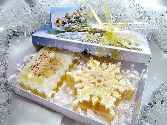 Indépendamment de la catégorie d'âge Les cosmétiques peuvent être donnés à tout le monde. Une bonne idée de cadeau sera savon artisanal, faite sous la forme d’un ange, d’un flocon de neige, d’une étoile, d’un croissant ou d’une autre forme qui sera associée à ces vacances d’hiver lumineuses. L'emballage doit également être festif et lumineux, et le plus souvent, une belle boîte-cadeau est attachée à l'origine à un tel savon artisanal.