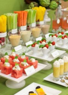 - ช่วงเวลาสำคัญคือ เขียนเมนู. ในกรณีนี้มีความจำเป็นต้องใช้สูตรอาหารที่เหมาะสมสำหรับเรื่องนี้ อย่าลืมว่าเด็ก ๆ ชอบขนมหวานมาก ๆ ดังนั้นแน่นอนว่าขนมคุกกี้และเค้กต่าง ๆ ควรอยู่บนโต๊ะในการแบ่งประเภท มีประโยชน์จะเป็นสารพัดทุกประเภทในรูปแบบมินิ ตัวอย่างเช่นมันสามารถเป็นทาร์ต, เสียบไม้, คานาเป้