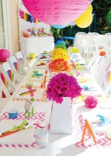 ไม่จำเป็นต้องใช้เวลาและพลังงานในการเตรียมตัว เด็กจะชื่นชมงานของคุณสามารถเรียนรู้จากพวกเขาและในอนาคตเพื่อจัดวันหยุดดังกล่าวให้กับลูก ๆ ของพวกเขา นอกจากนี้การตกแต่งที่ร่าเริงของโต๊ะรื่นเริงจะช่วยให้แขกวัยหนุ่มสาวสำหรับวันหยุดที่สนุกสนานและยกระดับจิตวิญญาณของพวกเขา