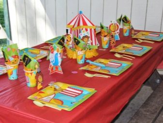 - สำหรับจานแล้ว แบบจำลองพลาสติกที่ดีที่สุด. กับพวกเขาคุณไม่สามารถกลัวงานเลี้ยงเด็กที่มีเสียงดัง มีชุดจานสีพิเศษคุณเพียงแค่หยิบช้อนและส้อม บนถ้วยคุณสามารถติดภาพตลก องค์ประกอบการตกแต่งที่เหมาะสมและหลากหลาย: ร่มตกแต่งหรือเสียบไม้