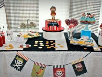 แขกผู้เข้าพักจะต้องประทับใจกับปาร์ตี้โจรสลัดที่ยิ่งใหญ่สำหรับเด็กผู้ชาย ที่นี่คุณจะต้องมีคุณสมบัติเพิ่มเติมเช่น bandanas, เสื้อ, หมวกโจรสลัด พวกเขาสามารถซื้อได้ที่ร้านค้าของเด็ก ๆ ขอแนะนำให้เสริมภาพด้วยมีดสั้นและหีบสมบัติที่น่าสนใจ ในบรรดาของหวานจะต้องเป็นกล้วยเหรียญช็อคโกแลตของขบเคี้ยวพร้อมอาหารทะเล