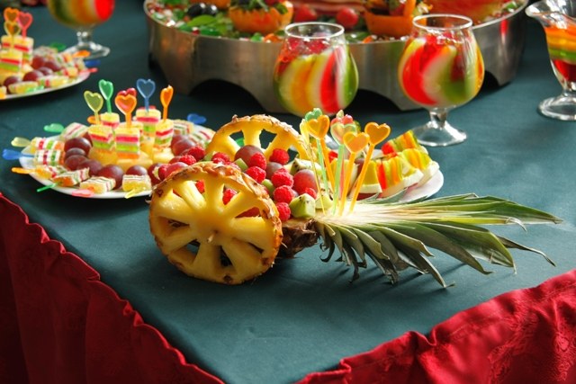 มีความจำเป็นต้องกำหนดอาหารจานหลักของว่างและเครื่องดื่ม อย่าลืมเกี่ยวกับผลไม้ พวกเขาจะตกแต่งตารางวันหยุดของเด็กอย่างสมบูรณ์แบบพวกเขาจะเป็นตัวเลือกที่มีประโยชน์และอร่อยในช่วงพักระหว่างเกมที่เล่นอยู่