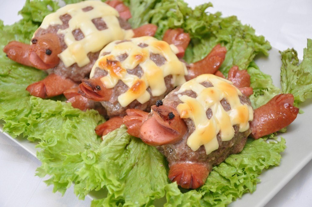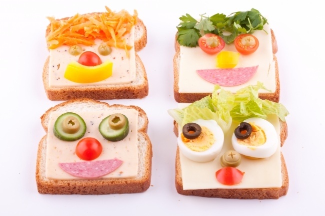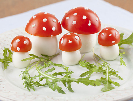 มันจะดูสนุกมากเห็ดจากไข่และมะเขือเทศเชอร์รี่ครึ่งและแซนวิชสามารถกลายเป็นใบหน้าตลกด้วยความช่วยเหลือของซอสมะเขือเทศ, ครีมและผัก แต่ผลไม้ที่คุณโปรดปรานควรเปลี่ยนเป็นช่อดอกไม้และตะกร้าที่กินได้จริง