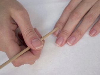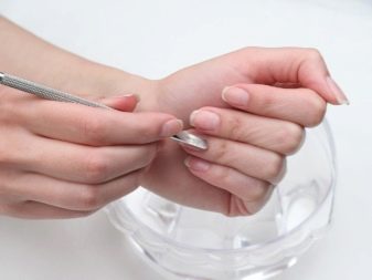 หยิบมือดันขึ้นดันหนังกำพร้าแล้วยกขึ้นหมุนขึ้น ควรทำเพื่อให้ง่ายต่อการตัดออกโดยไม่จำเป็นทั้งหมด หลังจากทำงานกับ pusher พวกเขาใช้กรรไกรหรือกรรไกรแล้วตัดสิ่งที่ทำความสะอาดที่ลูกกลิ้งด้านข้างและที่ฐานของเล็บออก