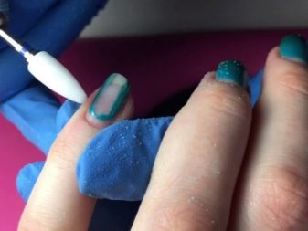 ตอนนี้คุณสามารถทาสีเล็บเจลขัดเงา มันถูกนำไปใช้ในชั้นบาง ๆ ตามด้วยการอบแห้งในหลอดไฟและปิดผนึกปลายเล็บ ด้วยสีผิวที่ดีอาจมีเพียงหนึ่งชั้น เมื่อเม็ดสีแห้งคุณสามารถวาดลวดลายแสตมป์สติ๊กเกอร์กาวได้ ถัดไปการออกแบบถูกปิดผนึกด้วยชั้นบนสุดและทำการอบแห้งขั้นสุดท้าย