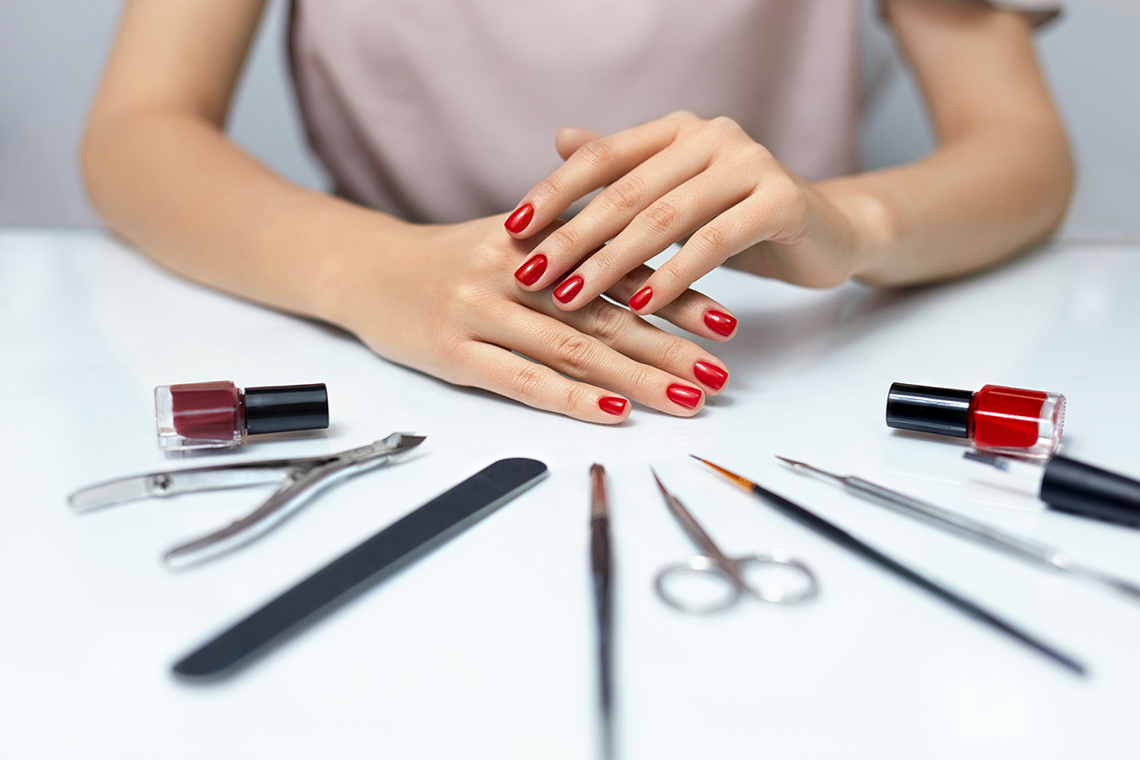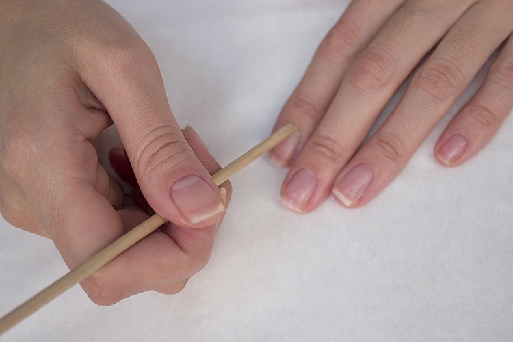 เก็บเครื่องมือไว้ในมุมหนึ่งเพื่อไม่ให้เส้นตัดเป็นช่วง ๆเพราะนี่คือสิ่งที่ทำให้แลคเกอร์ไหลผ่านหนังกำพร้าและการก่อตัวของเลนซ์ หลังจากตัดหนังกำพร้าแท่งสีส้มจะถูกส่งไปรอบ ๆ เตียงเล็บเพื่อตรวจสอบว่ามีการทำความสะอาดต้อเนื้อทั้งหมดหรือไม่ สิ่งที่จะฟุ่มเฟือยตัดด้วยกรรไกรหรือแหนบน้ำมันถูกนำไปใช้กับผิว