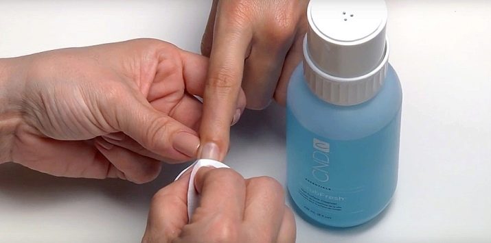 ก่อนอื่นคุณต้องทำการรักษาน้ำยาฆ่าเชื้อดาวเรือง มันเป็นสิ่งสำคัญที่จะไม่เติมแผ่นด้วยตัวเองเพราะน้ำยาฆ่าเชื้อใด ๆ มีผลให้ความชุ่มชื้น หากเงินทุนอยู่ในเล็บมากก็สามารถลดการยึดเกาะของแผ่นเล็บได้ด้วยผลิตภัณฑ์เคลือบเงาทุกชั้น หลังจากดำเนินการแล้วให้ทำเล็บมือที่ถูกสุขลักษณะ