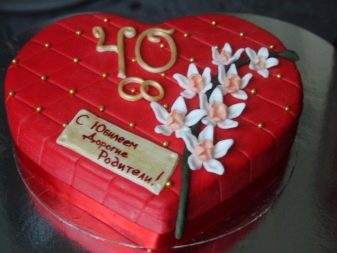 เค้กสำหรับวันครบรอบปีที่สี่สิบควรเป็นพิเศษและสอดคล้องกับรูปแบบของวันหยุด ทุกวันนี้ปรมาจารย์ขนมอบระดับปริญญาโทสามารถสั่งอาหารอันโอชะได้เกือบทุกการออกแบบรวมถึงเลือกรสนิยมตามความเหมาะสม โดยปกติแล้วเค้กบิสกิตที่มีหนึ่งหรือสองชั้นจะถูกเตรียมไว้สำหรับการเฉลิมฉลองมันถูกปกคลุมด้วยสีแดงเข้มและตกแต่งด้วยดอกไม้สีขาวครีมหรือมาร์ซิปัน