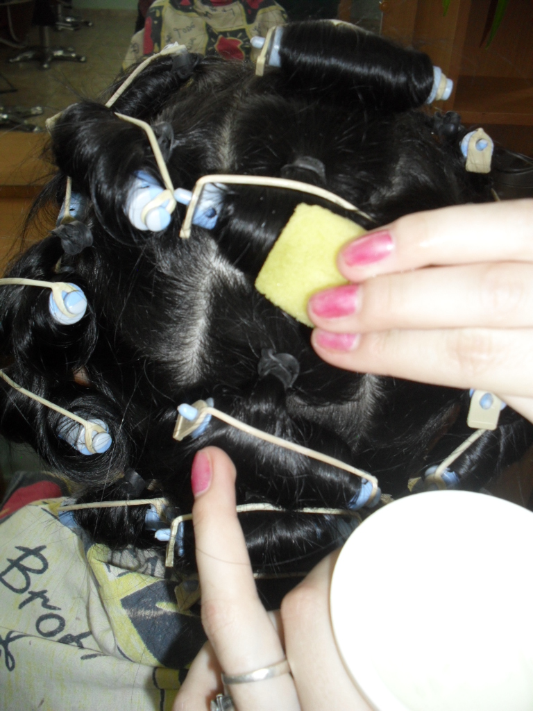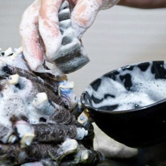 - หลังจากนั้น น้ำยาจะถูกชะล้างออกด้วยน้ำและผ้าพันแผลก็ชุ่มด้วยผ้าขนหนู ทำตามขั้นตอนต่อไปโดยใช้ตัวล็อคมันจะถูกกระจายโดยใช้ฟองน้ำ สลักยืนเป็นเวลา 7 นาทีและถอดม้วนผมออก