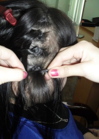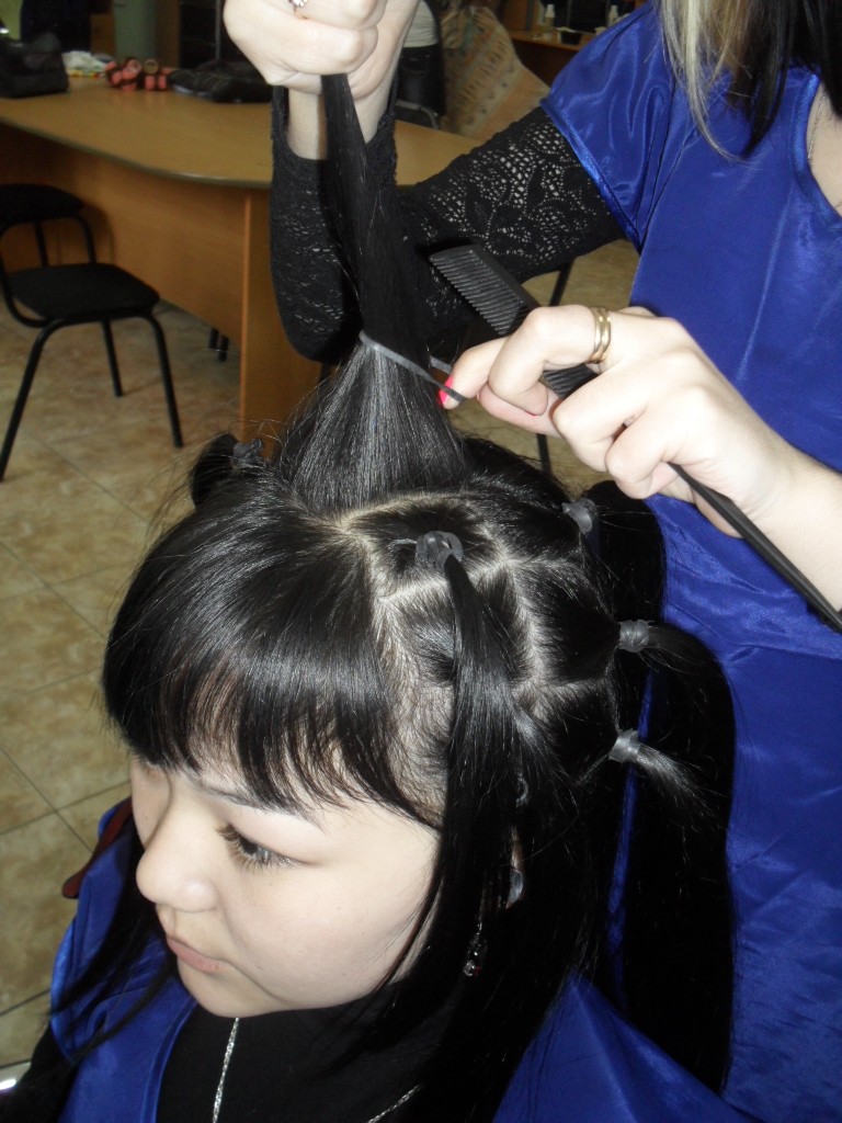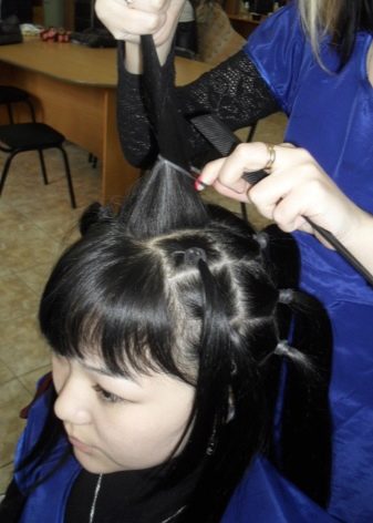 ชั้นแรกเริ่มที่จะทำในลำคอและดำเนินการต่อไปยังโซนท้ายทอย ข้างหน้าเส้นที่มีแผลต่อมงกุฎ สไตลิสที่เหลือจะถูกวางในลักษณะที่พวกเขาค่อยๆเคลื่อนไปด้านหลังของศีรษะ