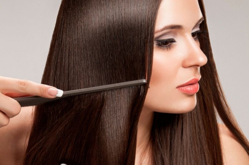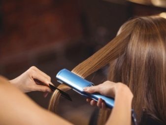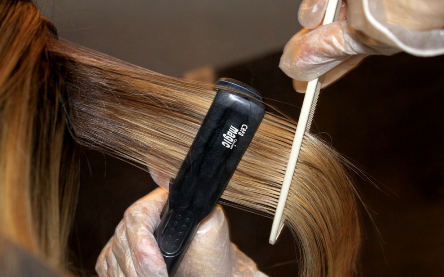 - ด้วยความช่วยเหลือของการรีดผ้าพิเศษจะต้องแยกแต่ละเส้นให้เรียบจึงช่วยให้เคราตินติดตั้งในโครงสร้างเส้นผม