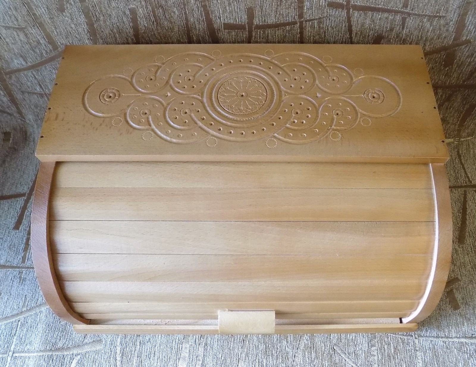 กล่องขนมปังทำจากไม้ในลักษณะที่คล้ายกันมีการใช้วัสดุแผงหรือชิ้นส่วนของแผ่นไม้ตามที่เห็นตามรูปแบบรายละเอียดจะถูกตัดออก การออกแบบดังกล่าวอาจแตกต่างจากฝาบานพับการมีชั้นวางภายในหรือแบ่งออกเป็นส่วน ๆ