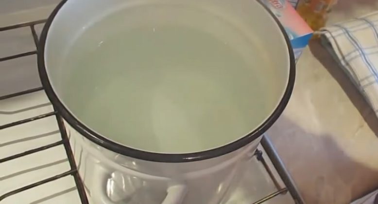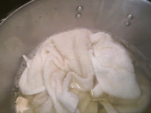 น้ำจะต้องต้มและเทลงในภาชนะที่จะมีการซักผ้า ส่วนประกอบอื่น ๆ ทั้งหมดจะถูกเพิ่มลงไปในน้ำ โปรดทราบว่าคุณสามารถใช้ผงสารฟอกขาวและน้ำมันที่ถูกที่สุดสำหรับการซัก ส่วนผสมทั้งหมดต้องผสมให้เข้ากัน ในการระงับที่เกิดขึ้นคุณต้องใส่ผ้าเช็ดตัวห้องครัวที่สกปรก โปรดทราบว่าสิ่งทอจะต้องแห้ง ในวิธีการนี้ผ้าควรนอนลงเป็นเวลา 2 หรือ 3 ชั่วโมง