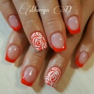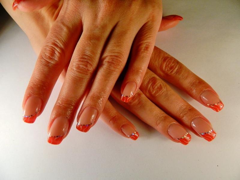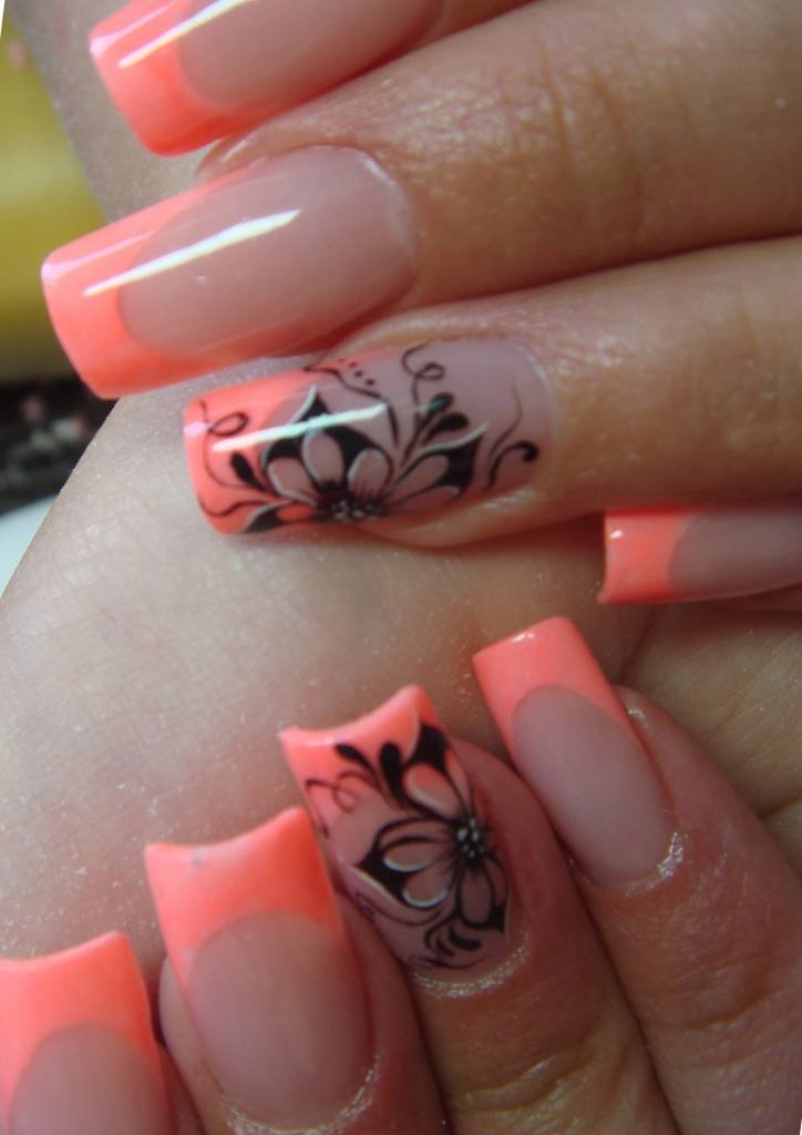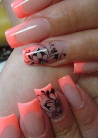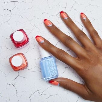ภาษาฝรั่งเศสในโทนปะการังสามารถรวมกับเทคนิคอื่นได้สำเร็จ บนพื้นผิวดังกล่าวเกือบทุกรูปแบบจะดูดี ขึ้นอยู่กับภาพที่ต้องการคุณสามารถวางบนพื้นผิวลวดลายหรูหราหรือลวดลายเล็ก ๆ บนขอบหรือปลายเล็บ