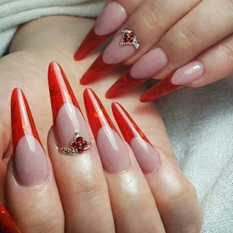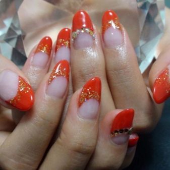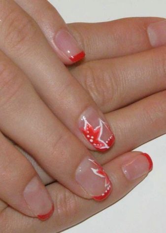 ตัวเลือกการออกแบบคลาสสิกฝรั่งเศส - เป็นเส้นขอบระหว่างแล็คเกอร์ใสในส่วนหลักและปลายสีที่โค้งมนในรูปทรงของเล็บ อาจารย์เสนอให้วาดเส้นขอบนี้ด้วยจินตนาการ - ในรูปแบบของลิ่มหรือแนวเฉียงผ่านเล็บทั้งหมด