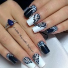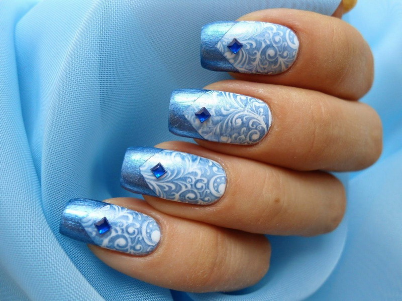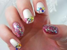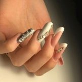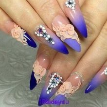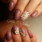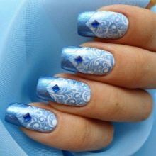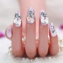 แจ็คเก็ตคลาสสิกที่ตกแต่งด้วย rhinestones ไปตามดวงจันทร์และลูกไม้ขนาดมหึมาจะทำให้ฮีโร่ของโอกาสนั้นยิ่งอ่อนโยนและมีเสน่ห์ ตัวแทนของแวดวงการสื่อสารอย่างไม่เป็นทางการในฐานะสำเนียงของแต่ละบุคคลสามารถเลือกทำเล็บด้วย rhinestones และกระดุมแบบโปร่งใสในรูปแบบของแหลมที่ได้รับการแก้ไขบนการเคลือบสีขาวนวลหิมะ ดอกไม้สีนู้ดกับพื้นหลังของ ombra สีชมพูสีฟ้าเสริมด้วยองค์ประกอบของ rhinestones ที่มีขนาดแตกต่างกันและเฉดสีให้ดูแปลกตามากและจะดึงดูดสายตาของผู้อื่นอย่างไม่ต้องสงสัย
