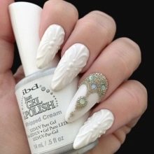 ในวันนี้เจ้าสาวจะต้องไม่อาจต้านทานได้บรรยากาศพิเศษของวันหยุดจะสร้างเจลทาเล็บแบบปริมาตร คุณสามารถเลือกแต่งเล็บแบบฝรั่งเศสคลาสสิกที่มีองค์ประกอบปูนปั้นเช่นดอกไม้ - มันมักจะชนะ เหมาะกับเล็บในวันเคร่งขรึมจะมีลักษณะเป็นไข่มุกชิ้นส่วนทองคำและเงิน rhinestones