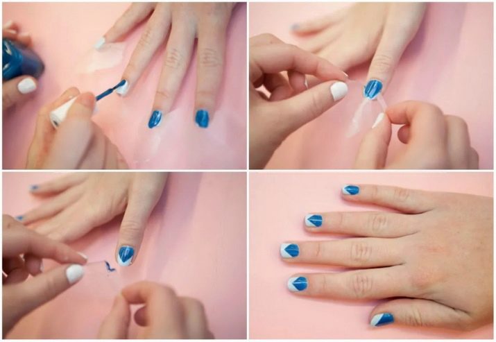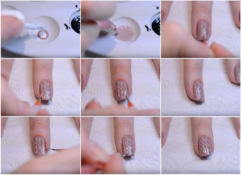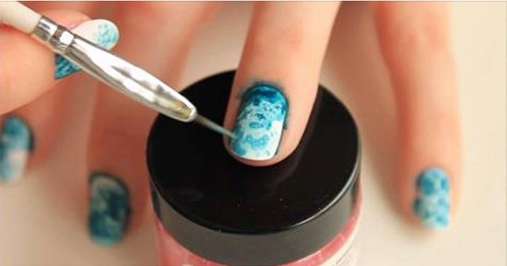องค์ประกอบทั้งหมดขององค์ประกอบจะถูกนำไปใช้กับแผ่นเล็บในรูปแบบที่จะได้รับการแก้ไข ชิ้นส่วนทั้งหมดที่มีสีแตกต่างกันจะถูกทำให้แห้งภายใต้หลอด UV นี่เป็นสิ่งจำเป็นเพื่อป้องกันการผสมของเฉดสี