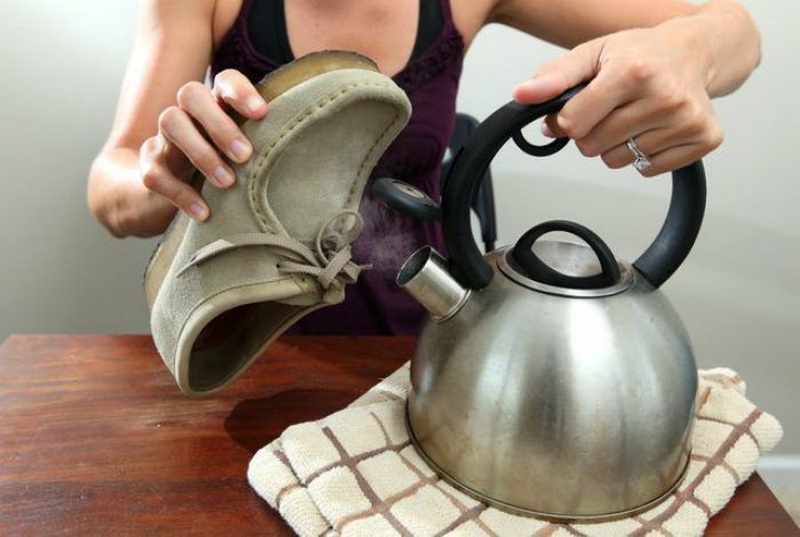 แม่บ้านหลายคนในบ้านกำจัดสิ่งสกปรกบนรองเท้าถือมันไว้เหนือไอน้ำอย่างไรก็ตามวิธีนี้มีข้อเสียเนื่องจากน้ำอาจมีสิ่งสกปรกต่าง ๆ ที่หลังจากการอบแห้งจะยังคงเปื้อนอยู่บนวัสดุ ดังนั้นเมื่อใช้ตัวเลือกนี้คุณควรมั่นใจในคุณภาพของน้ำที่ใช้เพื่อไม่ให้เกิดอันตรายกับรองเท้า