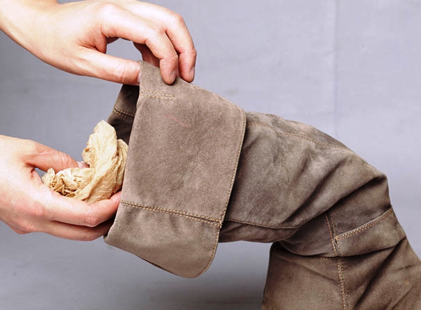 นอกจากนี้สิ่งสำคัญคือต้องหลีกเลี่ยงการสัมผัสกับแสงแดดระหว่างการเก็บรักษา การป้องกันที่ดีของการสะสมของฝุ่นบนกองจะเป็น "หวี" ปกติของหนังนิ่มซึ่งจะกำจัดการสะสมของสิ่งสกปรกลึกเพิ่ม villi ซึ่งจะเพิ่มความน่าดึงดูดภายนอกของรองเท้า ทางที่ดีควรเก็บรองเท้าที่ทำจากหนังกลับโดยห่อกระดาษ
