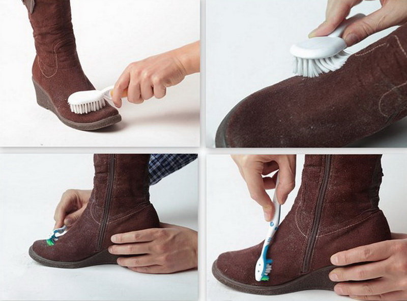 จำเป็นต้องใช้แปรงอย่างเคร่งครัดในทิศทางเดียวและสถานที่ต่าง ๆ เช่นข้อต่อระหว่างหนังนิ่มและรองเท้า แต่เพียงผู้เดียวซึ่งไม่ได้ออกมาเพื่อกำจัดสิ่งสกปรกด้วยแปรงสามารถประมวลผลด้วยสำลี แปรงสามารถจัดการกับชั้นพื้นผิวหลักของสิ่งสกปรกที่มีอยู่กำจัดฝุ่นและทำความสะอาดคราบเกลือ แต่เพื่อที่จะกำจัดคราบที่ฝังลึกและอายุมากกว่าบนรองเท้าโดยเฉพาะสีขาวหรือสีเบจคุณจะต้องใช้เงินทุนเพิ่มเติมสำหรับหนังนิ่มและพยายามมากขึ้น