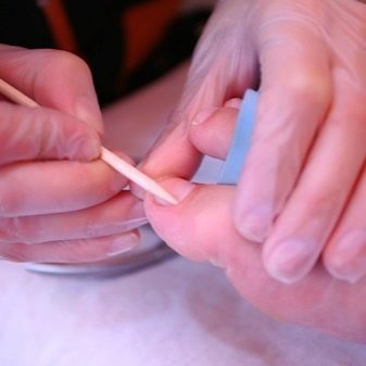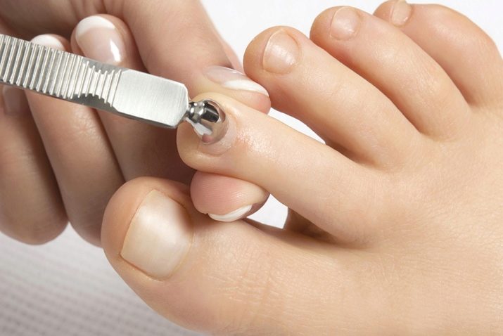 อย่างระมัดระวังด้วยไม้พายจากชุดทำเล็บเท้าเปลือกจะถูกยกขึ้น มันถูกลบด้วยเครื่องมืออื่น สิ่งสำคัญคือไม่ต้องสัมผัสเล็บและเนื้อเยื่อมีชีวิตใต้หนังกำพร้า ตัดผิวหนังทีละครั้งเพื่อไม่ให้เกิดเสี้ยนจากนั้นทาครีมลงบนนิ้วมือและเล็บ