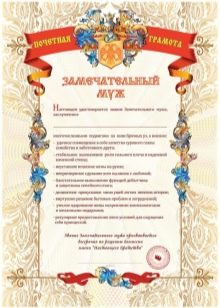 คำพูดของความกตัญญูและความเคารพสำหรับวันเกิดสามารถวางในใบรับรองทำเองวางไว้ในกรอบนี้ด้วยกระจกเพื่อให้ความศักดิ์สิทธิ์ ข้อดีที่แจกแจงของฮีโร่ในโอกาสนั้นอาจเป็นดังนี้: