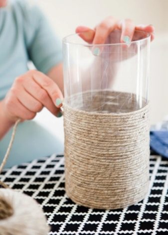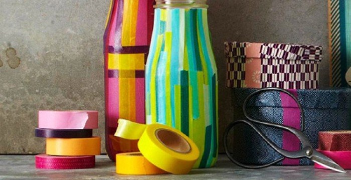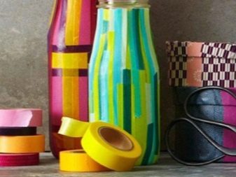 ขวดแก้วที่มีคอกว้าง, เกลียวหรือเส้นใหญ่, กาว PVA, กรรไกรและเทปสีจำเป็นสำหรับแจกันโฮมเมด