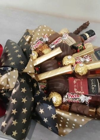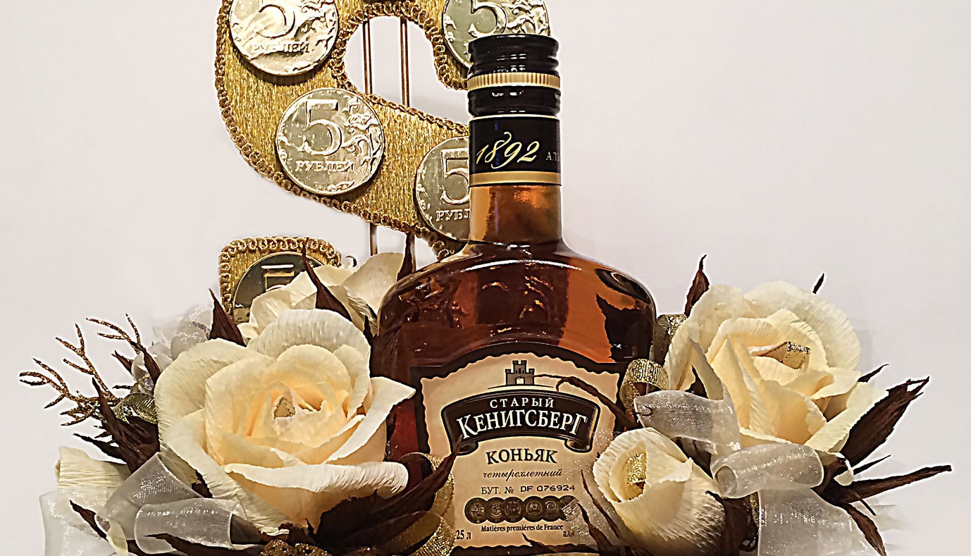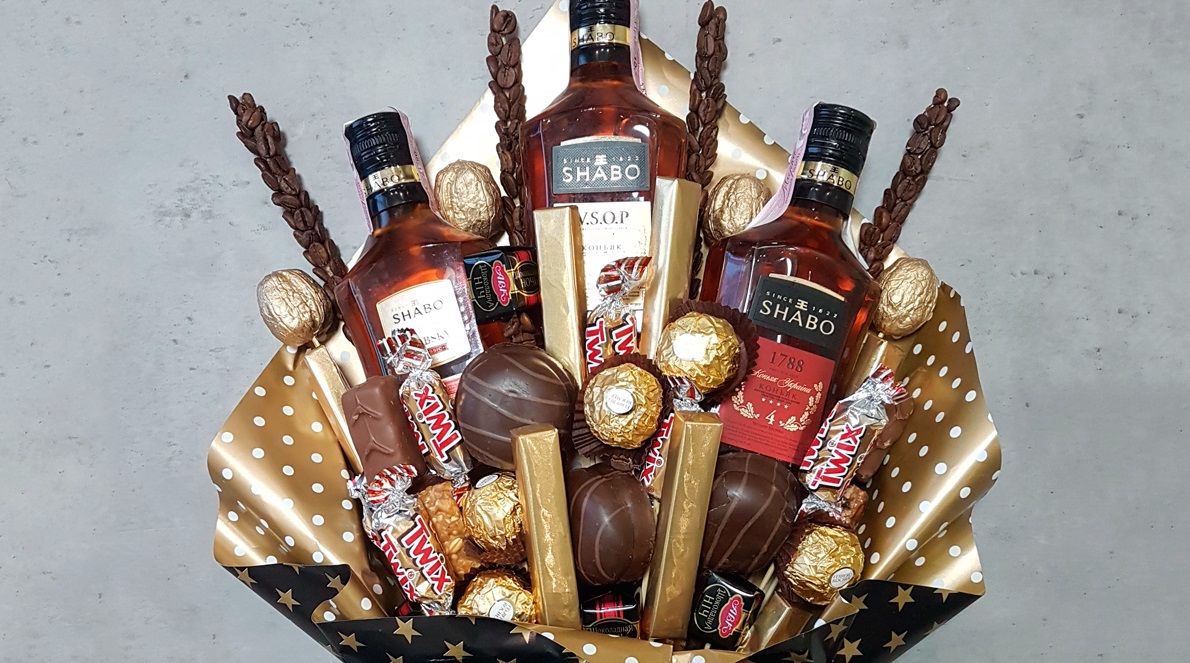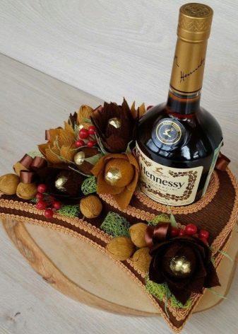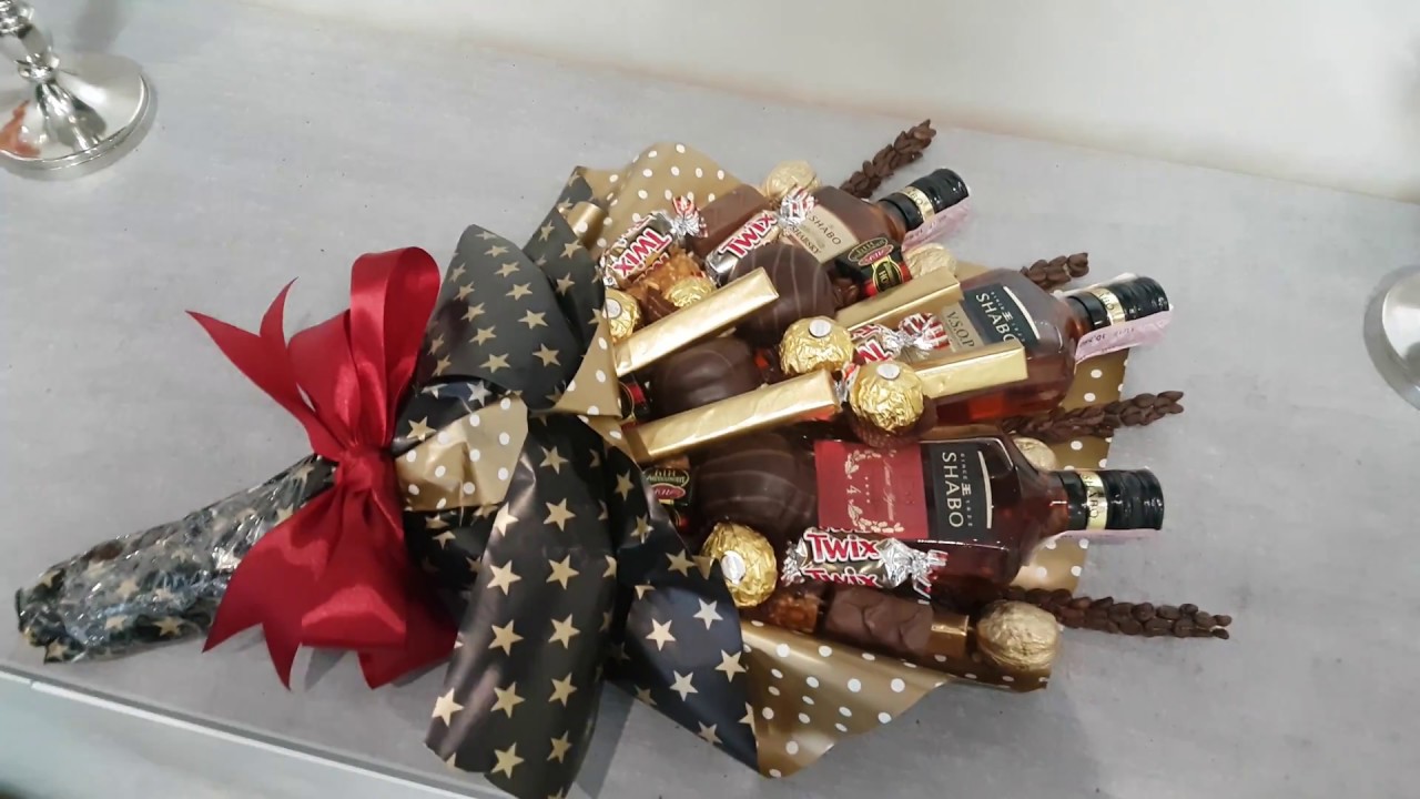 ของขวัญหวาน ๆ ที่เป็นของแข็งสำหรับคนวันเกิดด้วยมือของเขาเองสามารถทำเป็นรูปแท่งช่อพร้อมบรั่นดีหนึ่งขวด