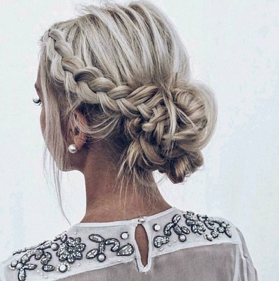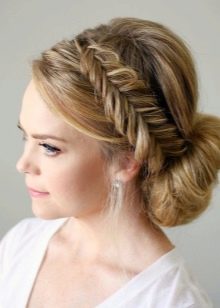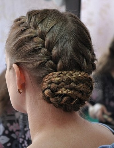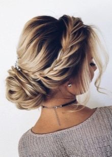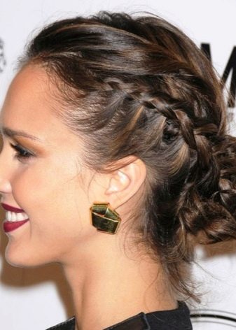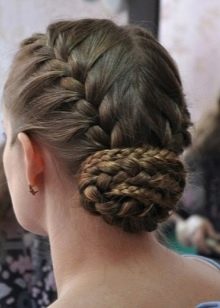 win-win สำหรับผมหนาที่มีความยาวปานกลางคือการสร้างการเปลี่ยนแปลงของ braids หนึ่งหรือหลายเป็นมวย คุณสามารถเริ่มทอผ้าถักเปียฝรั่งเศสจากวัดหรือจากบริเวณด้านหน้าของหัว จากนั้นบนมงกุฎหรือด้านล่างถักเปียจะถูกรวบรวมและจับจ้องไปที่หางพร้อมกับส่วนที่เหลือของผมและห่อรอบฐาน