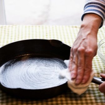 หลังจากทำความสะอาดอย่างทั่วถึงกระทะจะเสียชั้นของเขม่า แต่ด้วยชั้นที่ไม่ยึดติดและอาหารก็เริ่มไหม้ ผู้เชี่ยวชาญแนะนำหลังจากถอดสิ่งปนเปื้อนออกจากผลิตภัณฑ์ ดำเนินการบางอย่างเพื่อกู้คืนเลเยอร์นี้: