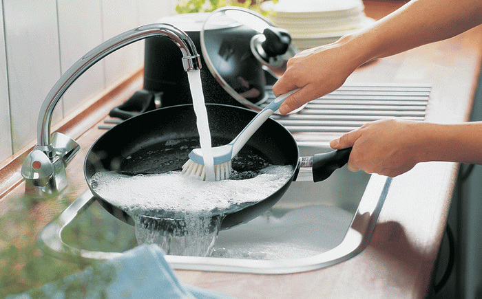 กระทะเทฟลอนมีการเคลือบแบบไม่ติดดังนั้นอาหารแทบจะไม่เหลืออยู่บนผนังของจาน หากการสะสมคาร์บอนปรากฏบนหน้าปกควรจำไว้ว่าห้ามใช้สารกัดกร่อนแปรงและใยขัดที่ทำจากโลหะอย่างเคร่งครัดเพื่อทำความสะอาด หลีกเลี่ยงการเปลี่ยนแปลงอุณหภูมิอย่างฉับพลัน