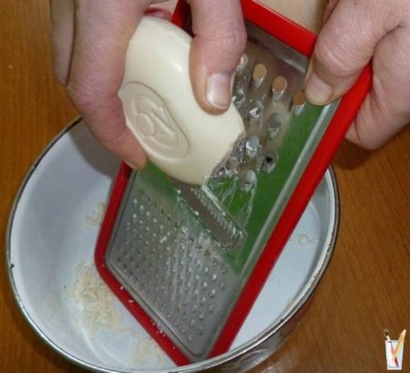 วิธีที่มีประสิทธิภาพมากขึ้นคือการใช้สบู่ซักผ้าซึ่งขาดไม่ได้เมื่อปรุงอาหาร น้ำสามลิตรจะต้องใช้โซดา 120 กรัมและสบู่หนึ่งก้อนถูบนที่ขูดเพื่อให้ละลายในน้ำได้ดีขึ้น สารละลายที่เตรียมไว้จะต้องได้รับความร้อนจากไฟ ก่อนที่จะต้ม 5 นาทีคุณสามารถจิ้มในกระทะแล้วต้มสักครู่ ถัดไปควรทิ้งผลิตภัณฑ์ไว้ในสารละลายสบู่เป็นเวลาสองชั่วโมงหลังจากนั้นคุณสามารถกำจัดสิ่งปนเปื้อนทั้งหมดได้อย่างง่ายดาย