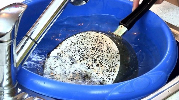 วิธีที่มีประสิทธิภาพและเป็นที่นิยมมากที่สุดคือการต้มกระทะแช่ในภาชนะที่มีน้ำและโซดาอย่างเต็มที่ ในการเตรียมสารละลายจะต้องโซดา 1 ช้อนโต๊ะต่อน้ำ 1 ลิตร ผลิตภัณฑ์จะต้องต้มประมาณ 10 นาทีจากนั้นทิ้งไว้อีกครึ่งชั่วโมงในการแก้ปัญหา หลังจากที่กระทะควรเช็ดด้วยแปรงหรือฟองน้ำเพื่อลบขยะ