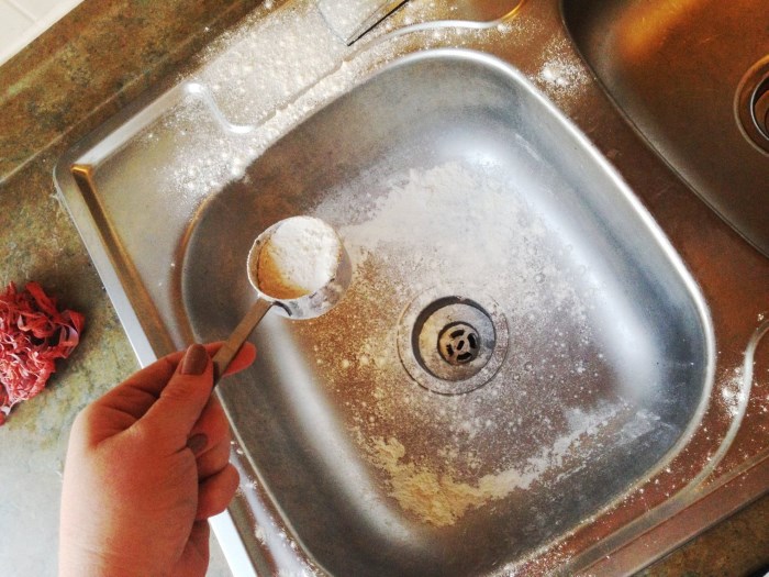 - นอกจากนี้เบกกิ้งโซดายังมีสีคล้ำและรอยเปื้อนได้ดี มันจะต้องถูกนำไปใช้กับด้านที่มีฤทธิ์กัดกร่อนของฟองน้ำเพิ่มน้ำเพื่อให้ข้าวต้มและถูพื้นผิวอย่างระมัดระวัง นี่เป็นกระบวนการที่ลำบาก แต่ค่อนข้างมีประสิทธิภาพ สิ่งสำคัญที่สุดคือล้างอ่างล้างจานให้สะอาดหลังจากปรุงแต่งทั้งหมด ในการทำความสะอาดมลพิษในสถานที่ที่เข้าถึงยากจะช่วยแปรงสีฟันเก่า
