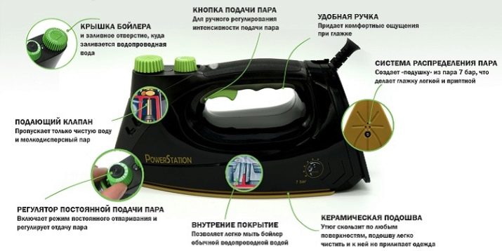 การออกแบบของอุปกรณ์มีในตัวหรือภาชนะแยกต่างหากที่มีองค์ประกอบความร้อน น้ำจะถูกเทลงไปซึ่งจะต้มด้วยไฟฟ้าและจะเปลี่ยนเป็นไอน้ำในไม่ช้า ในอุปกรณ์เพียงอย่างเดียวมีรูเล็ก ๆ ที่อนุญาตให้คู่ออกไปและเจาะเส้นใยของผ้าทำให้เรียบ